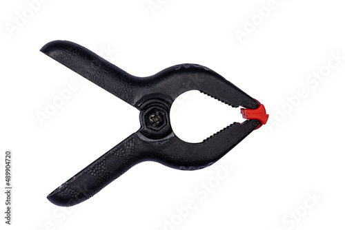 © Nynke, Obraz premium Black plastic clamp, isolated on a white background.