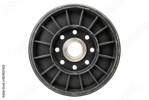 Obraz premium Black plastic idler pulley wheel with central metal bearing isolated on...