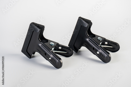 © apinya, Obraz premium Black plastic spring clamp isolated on white background.