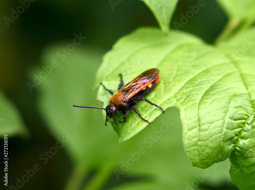 Naklejka premium Black plum sawfly on green leaf