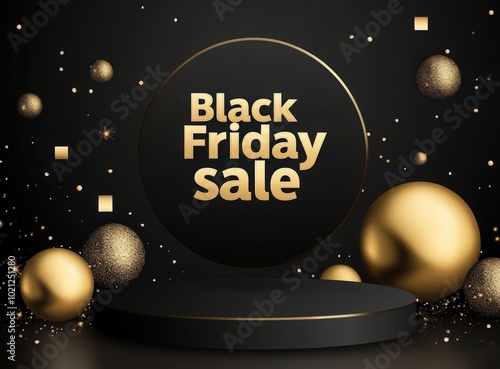 © Sabina Gahramanova, Fototapeta premium Black podium with golden spheres for product presentation on a black background. Black Friday sale banner template design with space to display your products or services.