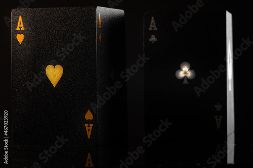 Obraz premium Black poker cards on a black background. Stylish composition. Casino, online...
