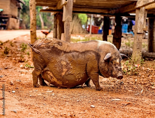 © khlongwangchao, Fototapeta premium Black pregnant pig on free range farm. Pregnant Pot-bellied pig, animal living farm