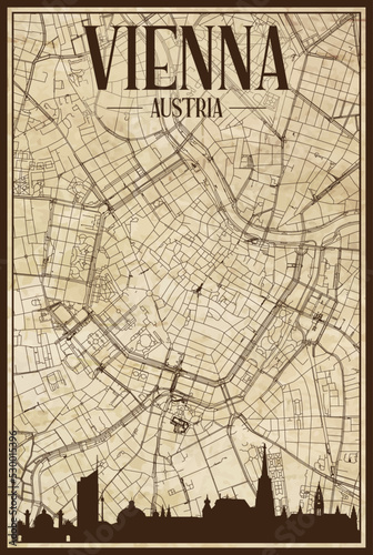 Obraz premium Black printout streets network map with city skyline of the downtown VIENNA, AUSTRIA on a vintage paper framed background