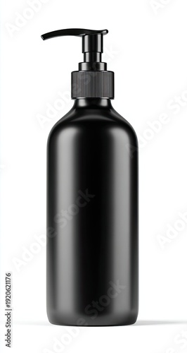 Fototapeta premium Black pump bottle, glossy finish, white background, vertical shot