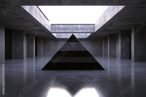 Fototapeta premium Black pyramid isolated in dark bunker room.