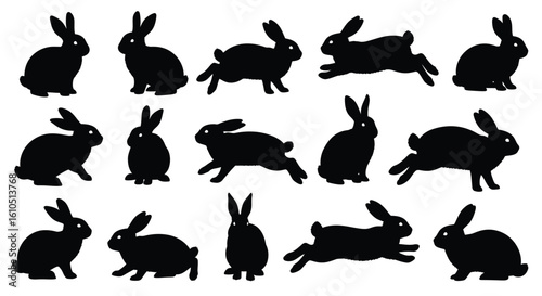 Obraz premium Black Rabbit Silhouette Collection Set on White Background for Easter and Spring Holidays Designs Vector Illustration