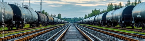 © taweesak, Fototapeta premium Black railway tanker cars of the type used to transport petroleum products Several cars visible on two separate sets of tracks Identification markings have been removed