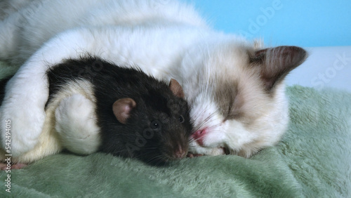 Fototapeta premium Black rat and white cat.
