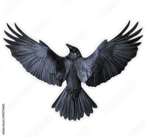 © Wijaya, Naklejka premium Black raven bird with wings spread in flight isolated on black background, spooky goth aesthetic