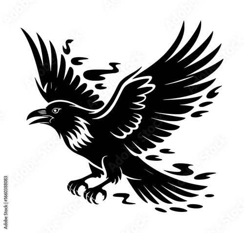 Fototapeta premium Black Raven in Flight with Stylized Feathers and Smoke