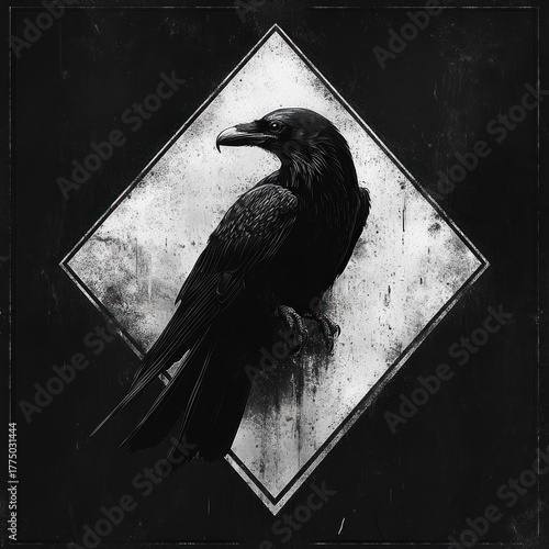 Naklejka premium Black raven perched against a textured diamond-shaped white background with a...