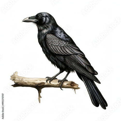 Naklejka premium Black raven perched on a branch.