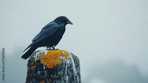 © watz, Fototapeta premium Black raven perched on a lichen-covered stone pillar against a misty grey sky.
