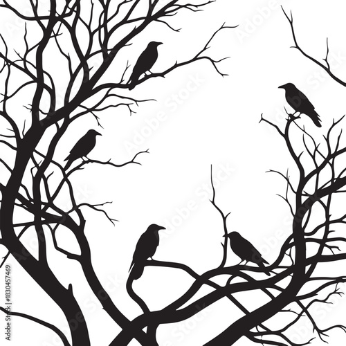 © Zakir, Naklejka premium Black raven silhouette perched on bare tree branches illustration
