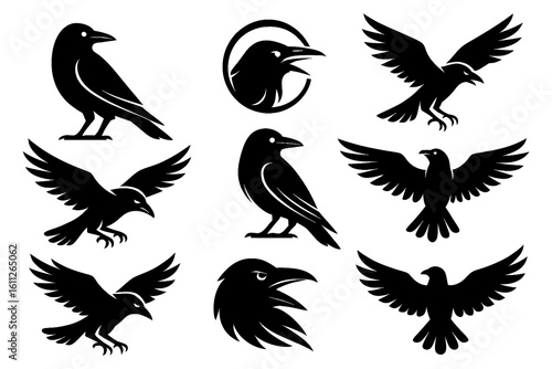 Fototapeta premium Black raven silhouettes in standing and flying positions, Transparent Background
