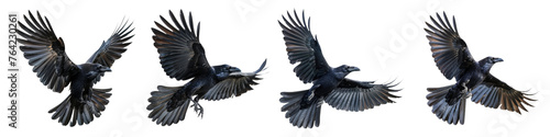 Fototapeta premium Black ravens in flight with outstretched wings on transparent background