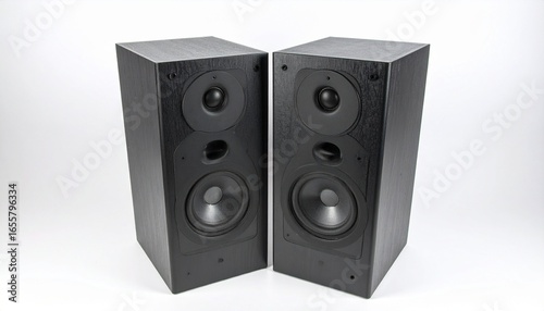 © Moon, Fototapeta premium Black rectangular speakers with circular drivers, side-by-side on neutral background, modern audio equipment.