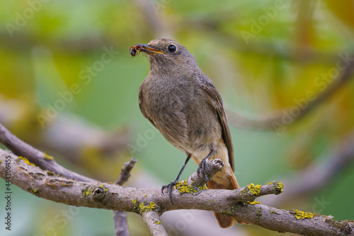 Fototapeta premium Black redstart - Phoenicurus ochruros standing on the branch with prey.