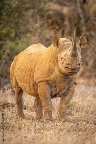 © Nick Dale, Fototapeta premium Black rhino stands eyeing camera on grass