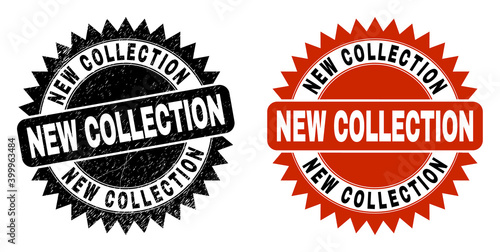 Obraz premium Black rosette NEW COLLECTION watermark. Flat vector distress seal with NEW COLLECTION message inside sharp rosette, and original clean version. Watermark with distress surface.