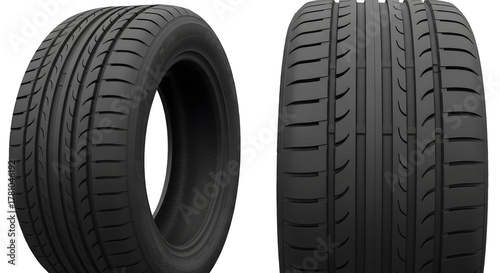 © KHALIED, Naklejka premium Black Rubber Tires, High-Performance Tread Tires, Low-Profile Car Tires, Front and Side Tire Views, Detailed Tire Tread Design