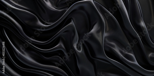 Fototapeta premium Black satin fabric background with waves and folds, abstract black cloth texture