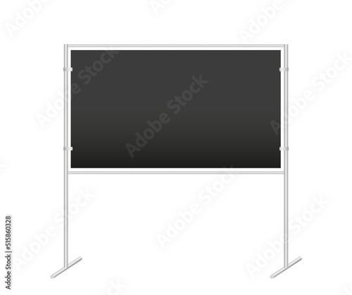 © yulliash, Obraz premium Black school chalkboard or information stand. Vector realistic Mock-up. Blackboard for writing, class board on two pillars, advertising press wall, presentation board. blank template. Front view.