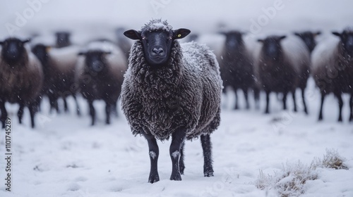 Naklejka premium Black Sheep Flock Winter Snow Blizzard Cold Frosty Field
