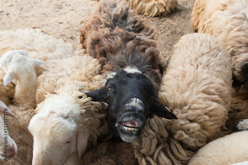 © sucharn, Naklejka premium Black sheep in white sheep herd. Funny face of black sheep.