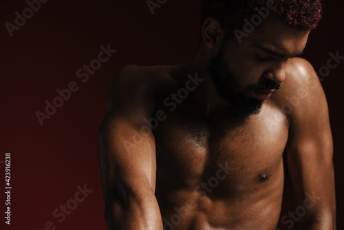 © Drobot Dean, Fototapeta premium Black shirtless bearded man posing and looking downward