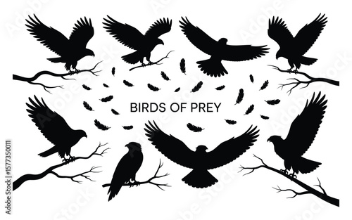 © Vector_Nest, Obraz premium Black Silhouette Birds of Prey Flying Perched Branches Feathers White Background predator eagle