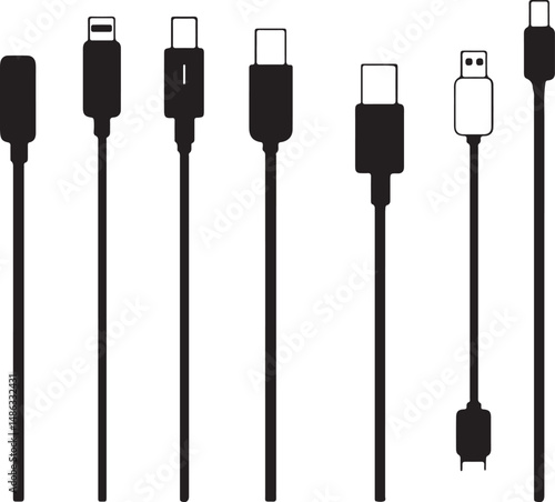 © SilhouetteStore, Naklejka premium Black Silhouette Cables: USB-C, Lightning, and More Charging Connectors