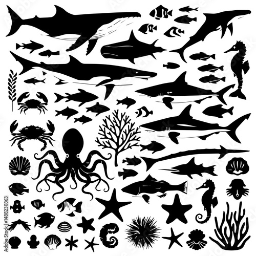 Naklejka premium Black silhouette collection of diverse marine life including fish, sharks,...