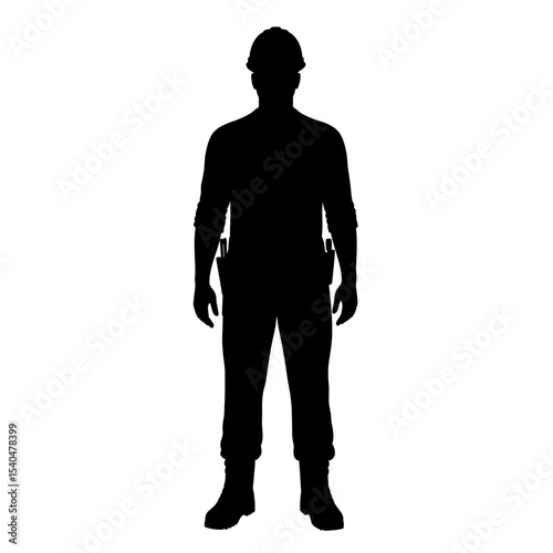 © salve, Fototapeta premium Black silhouette construction worker hard hat builder figure safety equipment construction building