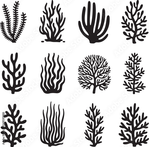 © Tanmoycre8, Fototapeta premium Black silhouette coral and seaweed patterns marine life underwater