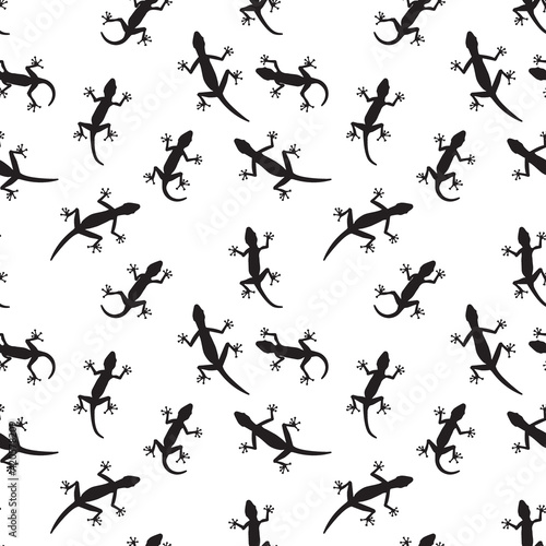 © olegganko, Naklejka premium Black silhouette creeping of lizard on white background. Seamless pattern. Vector Illustration