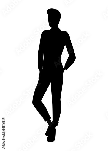 © Alfmaler, Fototapeta premium Black silhouette cute young man in fashion casual clothes cartoon character design flat vector illustration isolated on white background