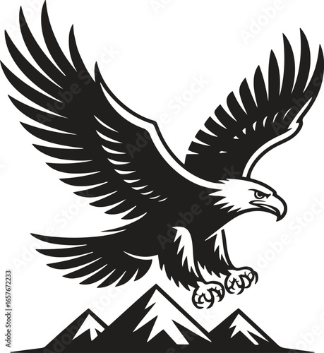 © Shakib Islam, Obraz premium Black silhouette design of a eagle flying over mountains icon isolated on white background. vector illustration