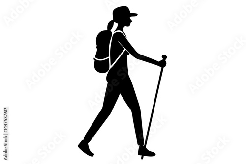 Fototapeta premium Black silhouette design on white woman hiking wearing a cap and long sleeved top, silhouette, woman, hiking, trekking, outdoors, adventure, nature, active, lifestyle, cap, hat, long sleeved, top