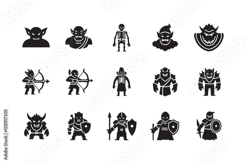 Fototapeta premium Black Silhouette Fantasy Creatures and Warriors Set