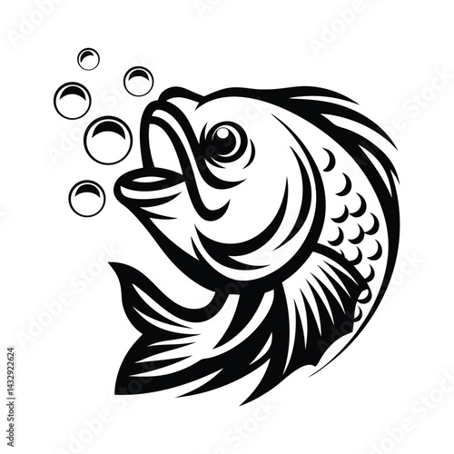 Naklejka premium Black Silhouette Fish Illustration, Bubbles Ascending, Detailed Fins and Open...