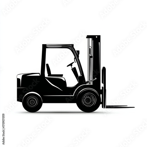 © Gary, Naklejka premium Black silhouette forklift icon, industrial vehicle design, clean minimal vector style, isolated on transparent background, suitable for warehouse, logistics, and industrial stock illustration use