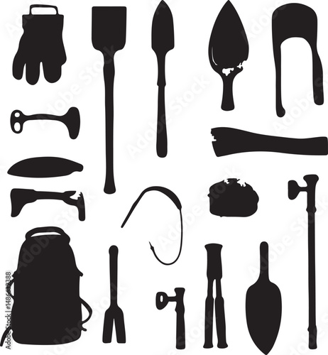 Fototapeta premium Black Silhouette Garden Tools: Gloves, Trowels, Shovels, and Backpack