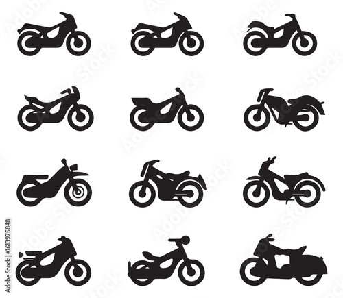 Naklejka premium Black silhouette icons depicting various motorcycle types arranged on a white...