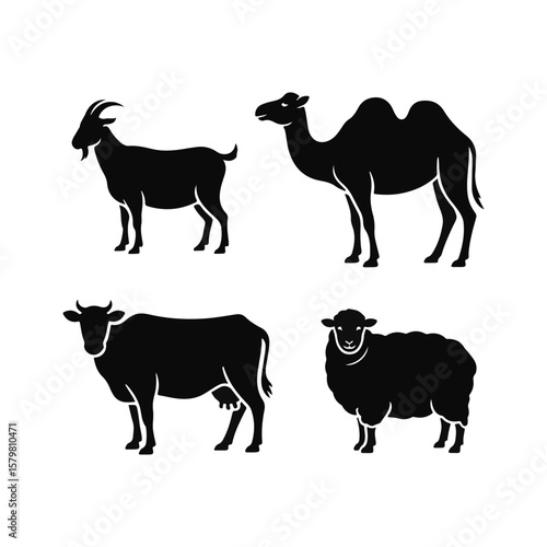 Fototapeta premium Black Silhouette Illustration Goat, Camel, Cow, and Sheep Animal Graphics