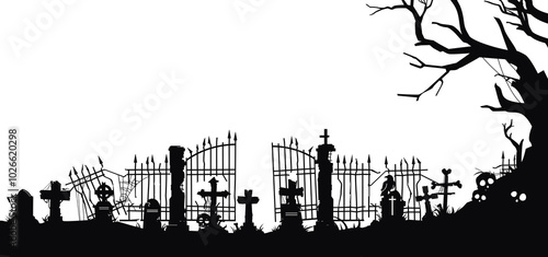 © Artoniumw, Fototapeta premium black silhouette illustration of tombstones, crosses and gravestones, cemetery elements with creepy fence. cemetery panorama
