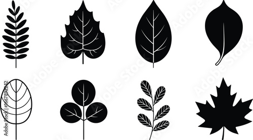 Fototapeta premium Black silhouette leaf collection illustration, botanical foliage vector art, plant shape design, nature graphic elements, decorative leaf artwork, tropical and garden leaves