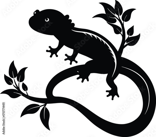 Fototapeta premium Black Silhouette Lizard on Branch with Leaves Vector Art