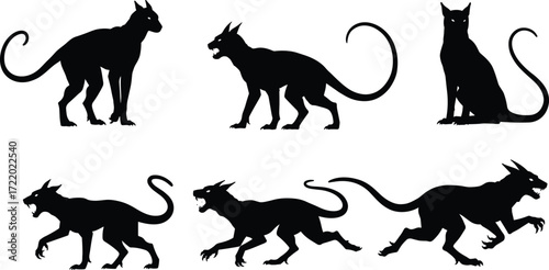 Naklejka premium Black silhouette mythical cats, fantasy feline creatures, aggressive and calm poses, running, leaping, crouching, stylized animal art illustration
